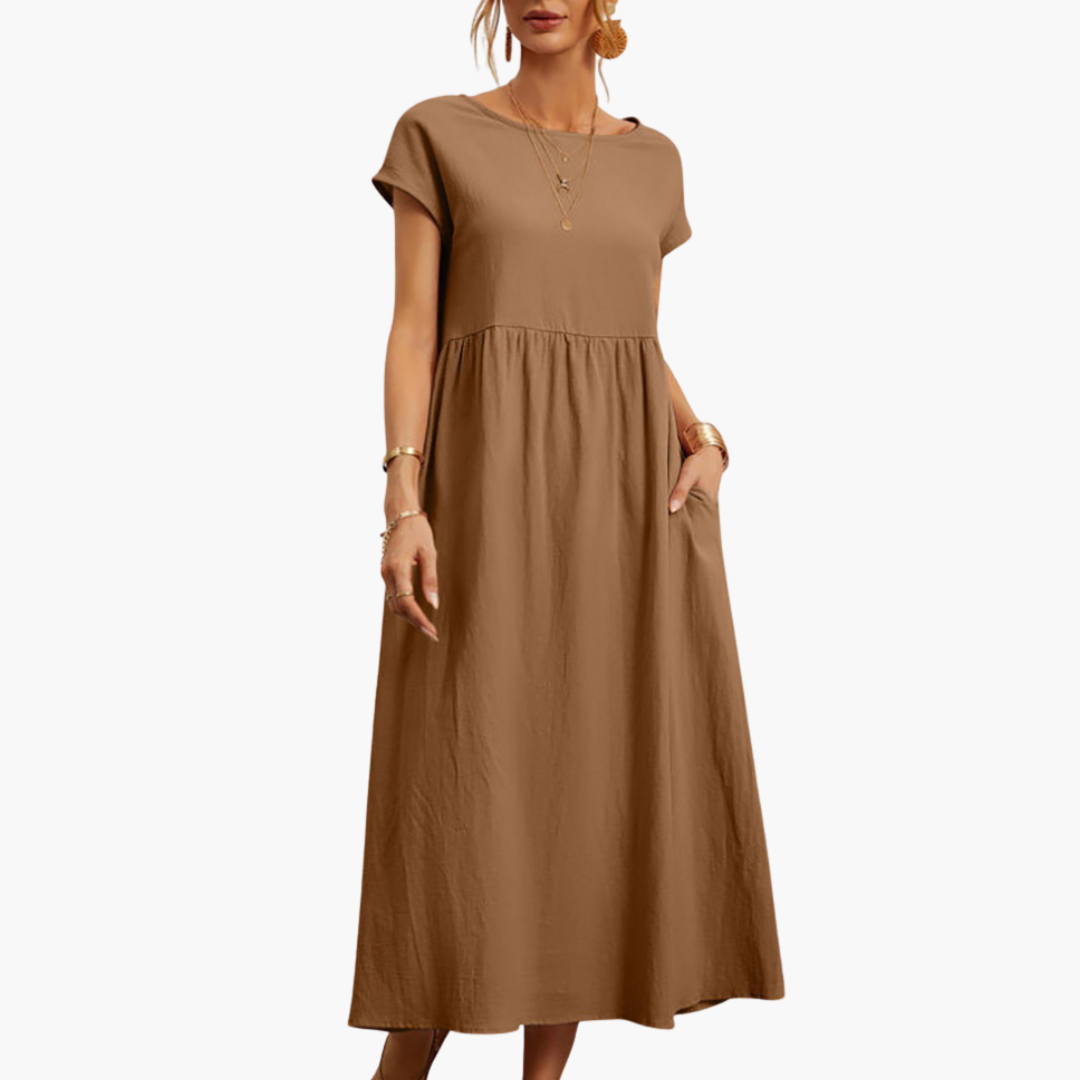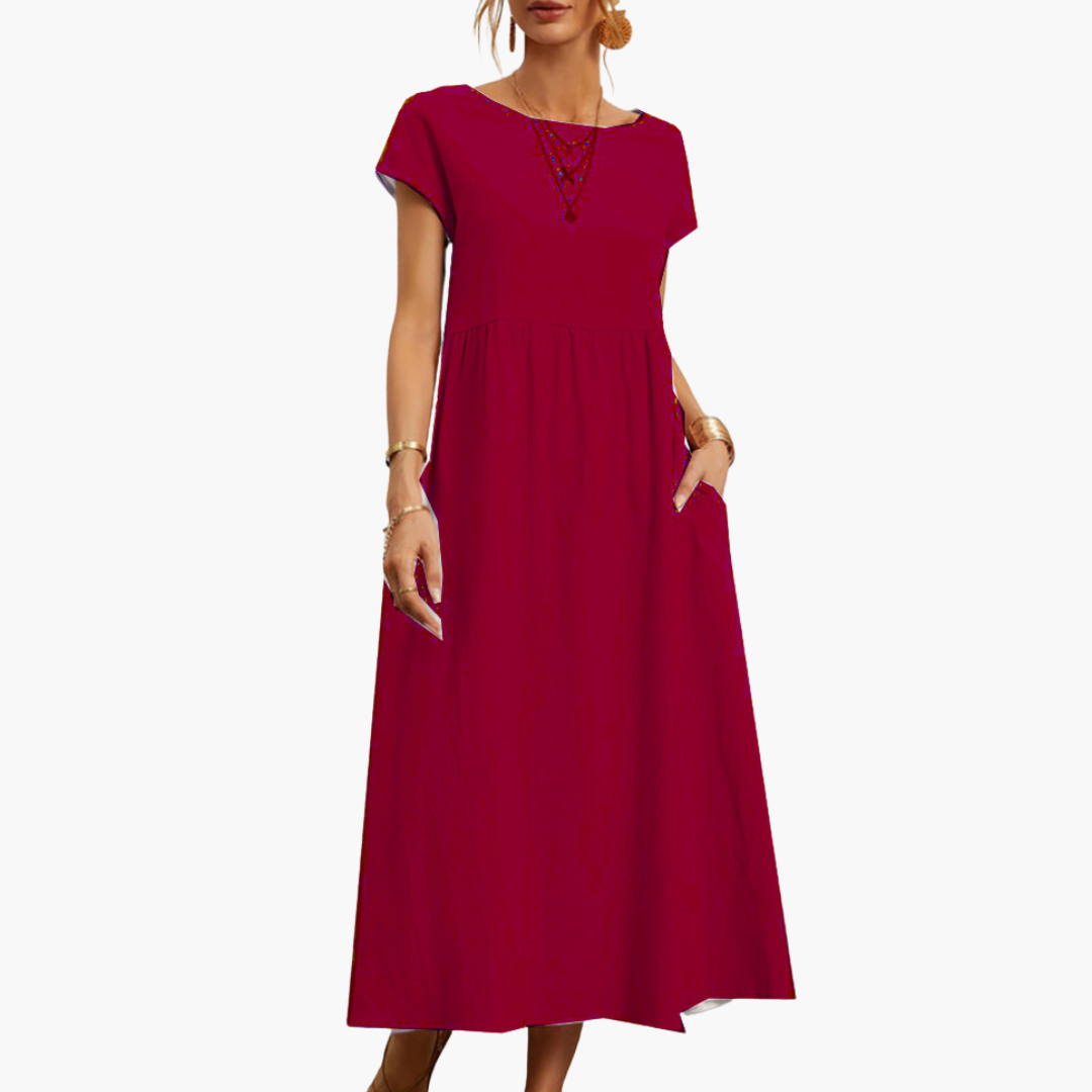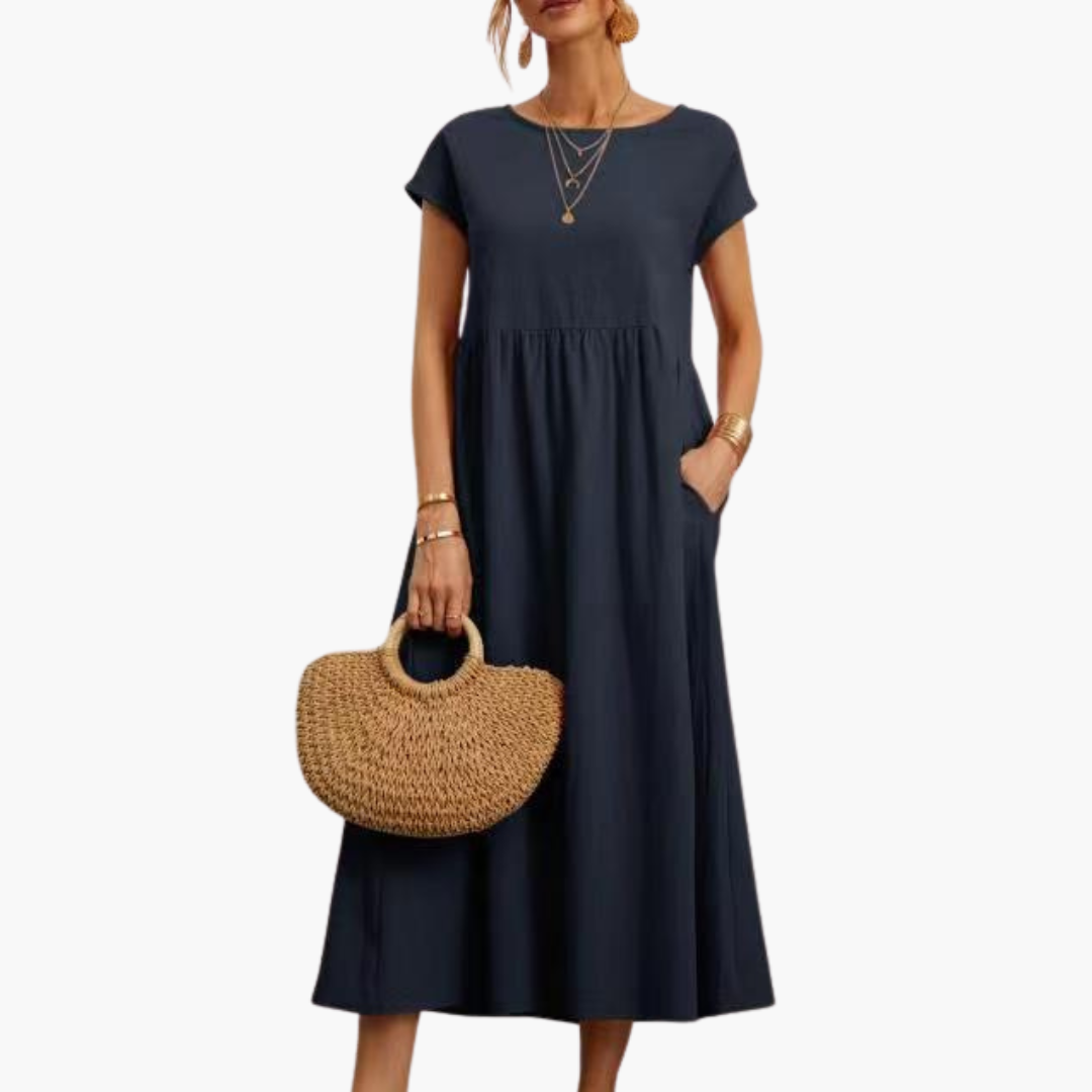 • Design: Maniche corte e taglio lungo per un look raffinato.