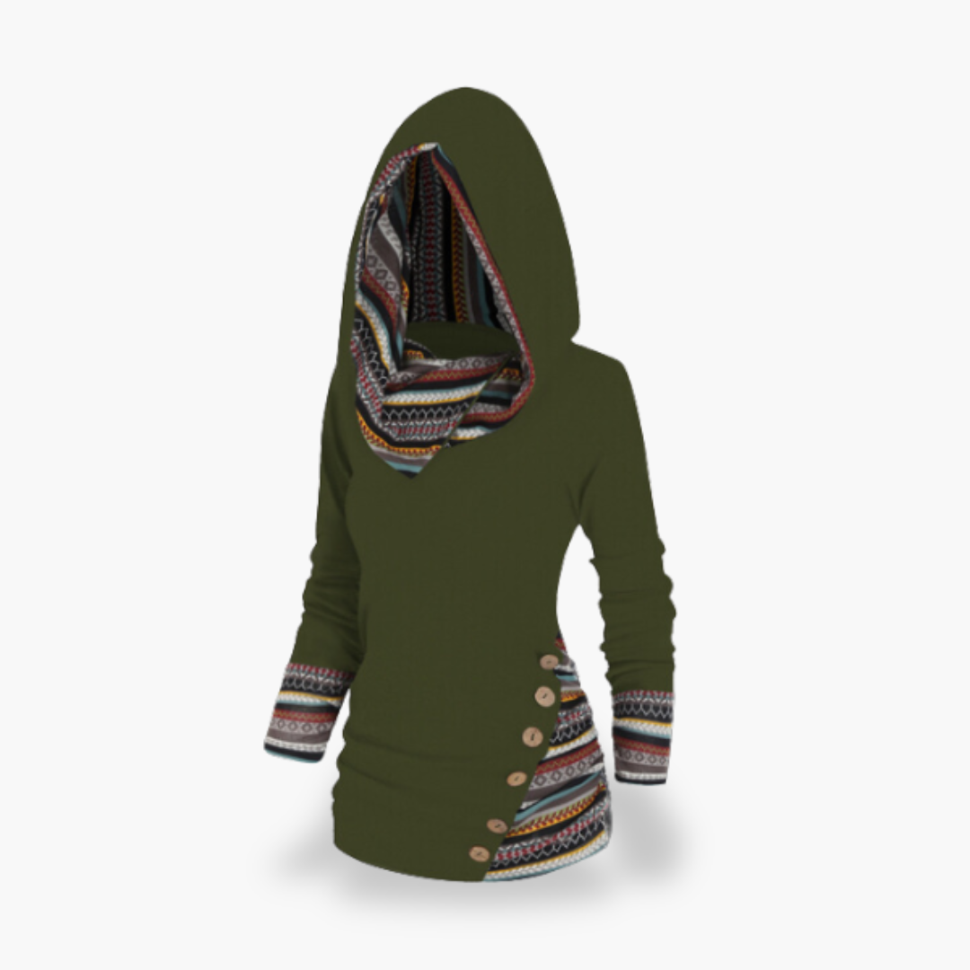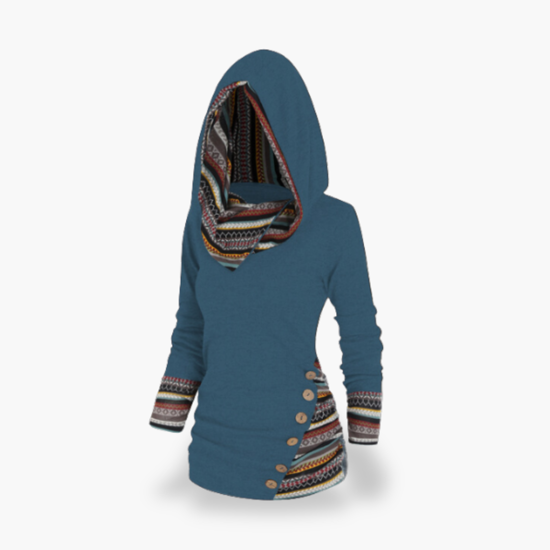 La felpa da donna Altivaro è un capo pratico e versatile, adatto al tempo libero e all’uso quotidiano. Il design con cappuccio ampio e interno fantasia aggiunge un elemento distintivo, mentre i bottoni laterali e le finiture a motivo etnico completano lo stile. Il tessuto in poliestere è morbido e traspirante, rendendo questa felpa adatta alle stagioni più fresche.