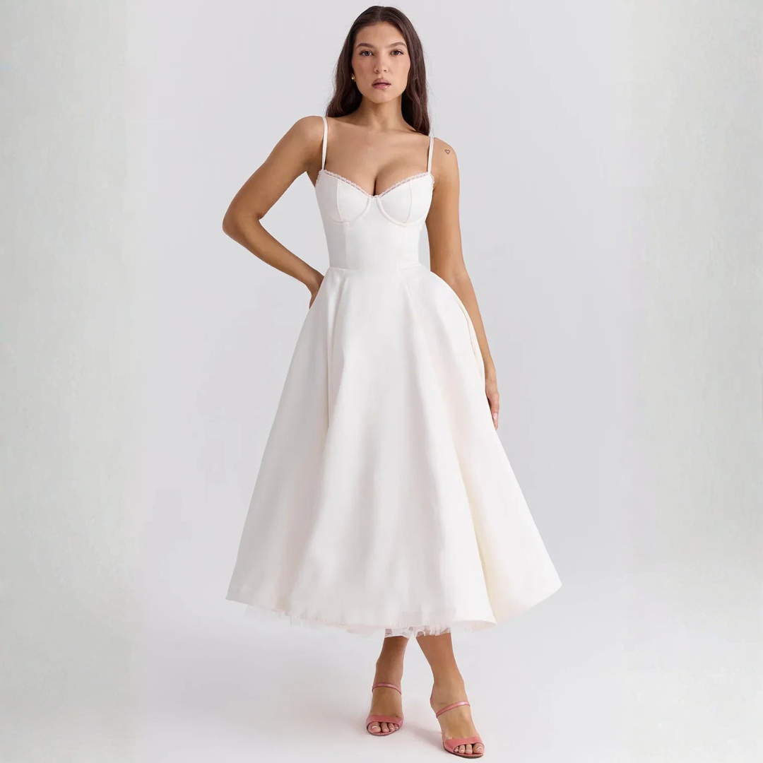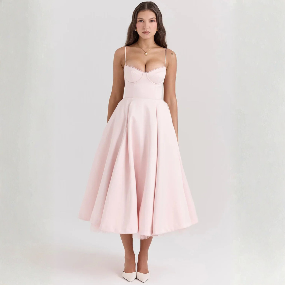 The model features a corset bodice with thin straps, a wide circle skirt, and an integrated tulle underskirt. Functional side pockets are present. The fabric construction helps maintain shape during wear. Designed for adult women, it is available in light blue, black, floral, pink, and white colors.